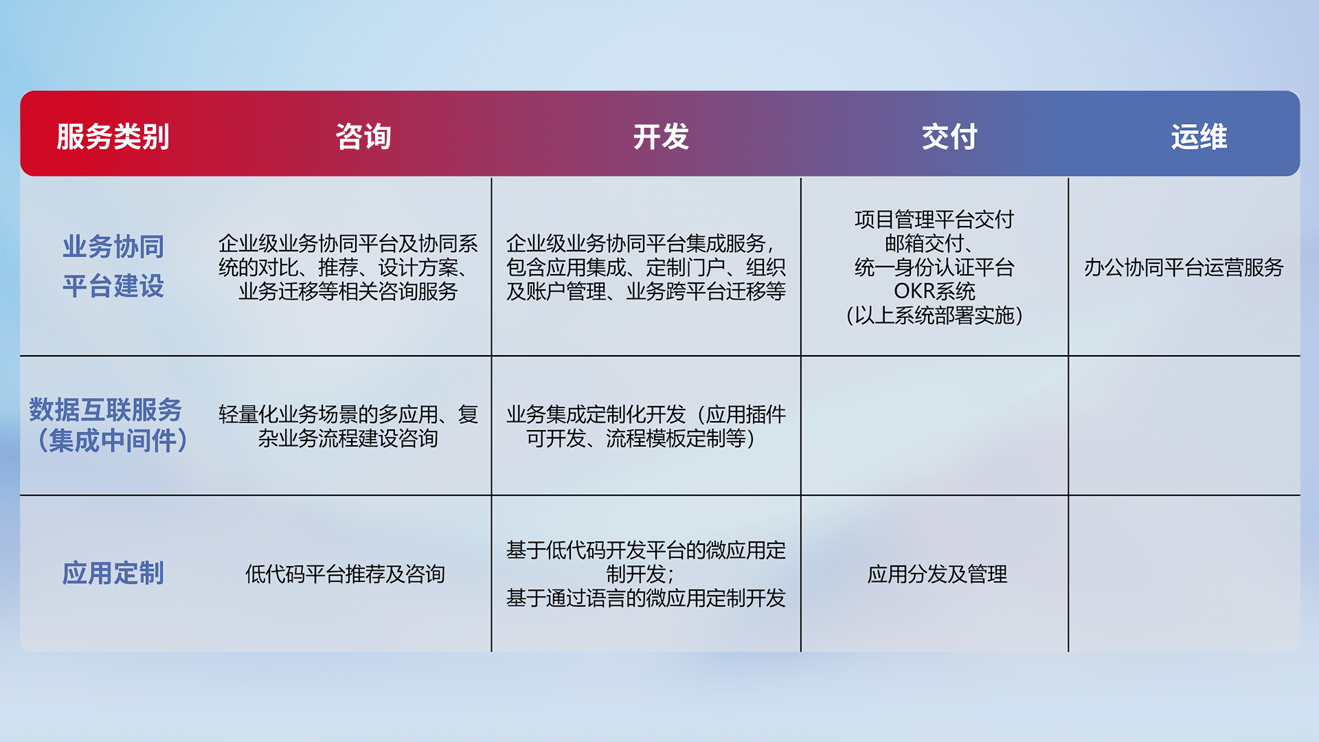 针对钉钉、、企微、、、IDaas等平台级产品提供产品的规划、、、方案、、交付、、、定制化开发等服务,,,,实现如统一协同办公、、、、智能客户服务、、混合会议管理、、、、智能数据查询、、等业务场景,,实现数字化转型。。。
